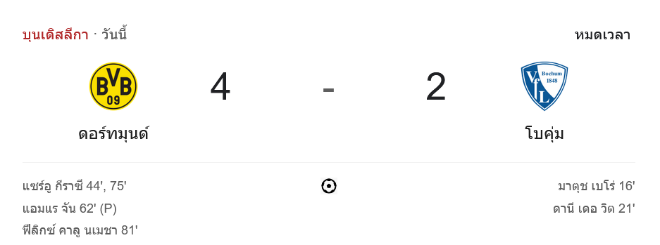 - นาทีที่ 81: เฟลิกซ์ เอ็นเมชา ยิงประตูปิดท้ายให้ดอร์ทมุนด์ชนะ 4-2