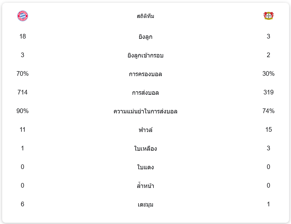 แม้ว่าฝั่ง บาเยิร์น มิวนิค จะเป็นทีมที่ครองบอลได้มากถึง 70% และส่งบอลได้อย่างแม่นยำถึง 90% จากจำนวนการส่งทั้งหมด 714 ครั้ง แต่ก็ไม่สามารถทำประตูเพิ่มได้ มีโอกาสยิงทั้งหมด 18 ครั้ง แต่เข้ากรอบเพียง 3 ครั้ง ส่วนทางด้าน ไบเออร์ เลเวอร์คูเซิน ที่ครองบอลเพียง 30% มีโอกาสยิงเพียง 3 ครั้ง และเข้ากรอบไปถึง 2 ลูก ทำให้เกมนี้เป็นการแข่งขันที่เต็มไปด้วยการเล่นที่แม่นยำแต่ไม่มีโอกาสในการจบสกอร์