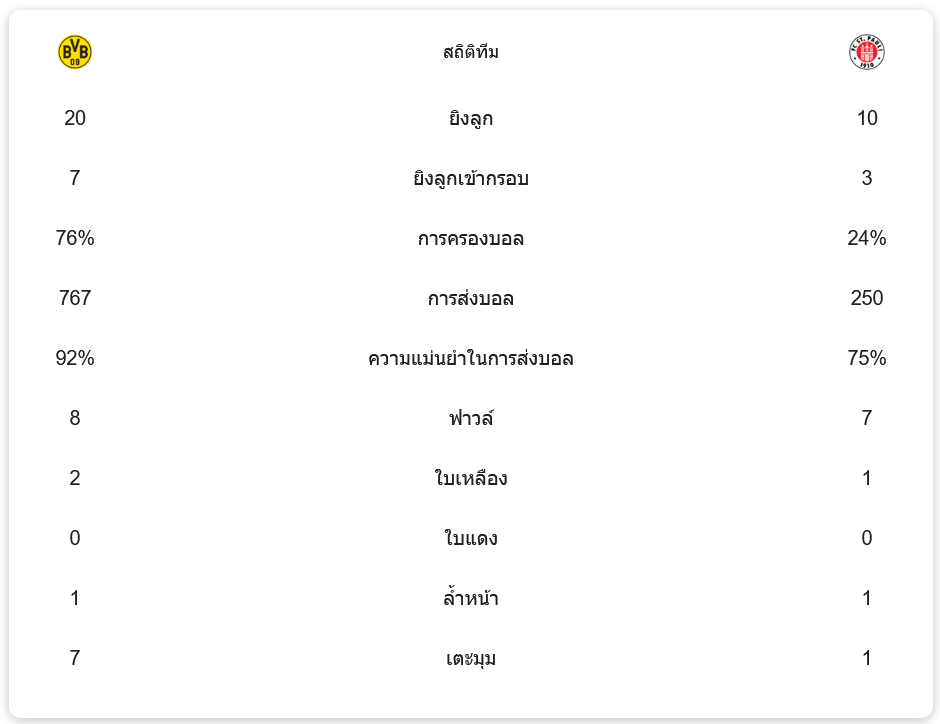 การแข่งขันครั้งนี้ ดอร์ทมุนด์ ครองเกมได้อย่างชัดเจน ด้วยการครองบอลสูงถึง 76% และการส่งบอลแม่นยำถึง 92% รวม 767 ครั้ง ขณะที่ซังค์ เพาลีครองบอลได้เพียง 24% และการส่งบอลแม่นยำอยู่ที่ 75% แม้ว่าซังค์ เพาลีจะมีโอกาสยิง 10 ครั้ง แต่ดอร์ทมุนด์ทำได้ถึง 20 ครั้ง โดยยิงเข้ากรอบ 7 ครั้ง เทียบกับซังค์ เพาลีที่มีเพียง 3 ครั้ง