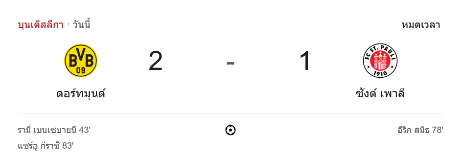 การแข่งขันบุนเดสลีกา 2024 นัดล่าสุด บ้านกีฬา รายงานว่า โบรุสเซีย ดอร์ทมุนด์ สามารถเฉือนชนะทีมเยือน ซังค์ เพาลี 2-1 ในเกมที่เต็มไปด้วยการต่อสู้ดุเดือด ณ สนามซิกนัล อิดูนา พาร์ค แม้ว่า ซังค์ เพาลี จะพยายามต่อสู้และตีเสมอได้ในครึ่งหลัง แต่ประตูชัยจากทีมเจ้าบ้านในช่วงท้ายเกมทำให้ดอร์ทมุนด์เก็บสามแต้มสำคัญได้สำเร็จ