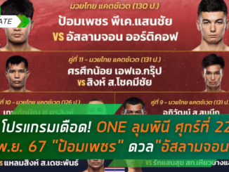 โปรแกรมมวยไทย ONE ลุมพินี ศุกร์ที่ 22 พ.ย. 67 พบคู่เอกเดือด! ป้อมเพชร พีเค.แสนชัย ดวลเดือด อัสลามจอน ออร์ติคอฟ