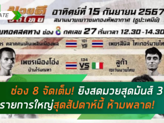โปรแกรมมวยไทยวันนี้ วันอาทิตย์ที่ 15 กันยายน 2567 ตารางมวยไทยจากหลายเวที พร้อมลิงก์ดูมวยสดผ่านช่อง 7 HD, ช่อง 8, ททบ.5 HD และบ้านกีฬา