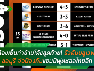 ห้องเย็นท่าข้าม รัวดับบลูเวฟ ชลบุรี 5-4 ในศึกฟุตซอลไทยลีก 2024 จ่อป้องกันแชมป์สมัยที่ 2 การท่าเรือยังมีลุ้น ส่วนฟุตซอลไทยอาร์มี่ตกชั้นทีมแรก!