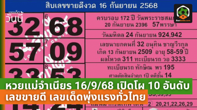หวยแม่จำเนียร 16/9/68 เปิดโผ 10 อันดับเลขขายดี เลขเด็ดพุ่งแรงทั่วไทย