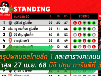 สรุปผลบอลไทยลีก 1 และตารางคะแนนล่าสุด (27 เม.ย. 68): บีจี ปทุม การันตีที่ 3, เมืองทองเฮส่งท้าย, ขอนแก่นช้ำตกชั้น