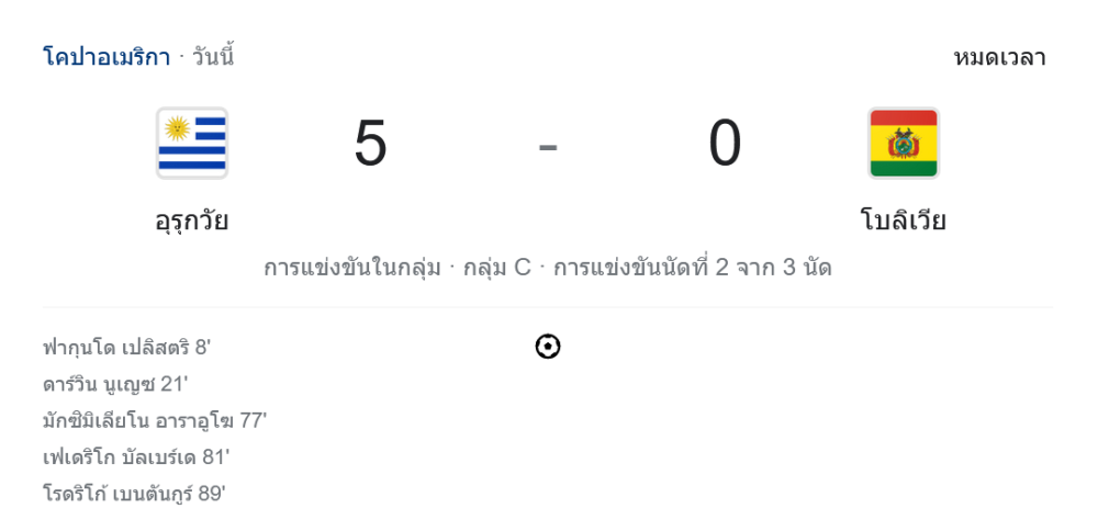 ผลการแข่งขันฟุตบอลโคปาอเมริกา 2024 กลุ่ม C ทีมชาติอุรุกวัย vs ทีมชาติโบลิเวีย วันนี้ 28 มิถุนายน 2567 ดูบอลย้อนหลัง คลิปไฮไลท์ ดูบอลโคปาอเมริกา 2024