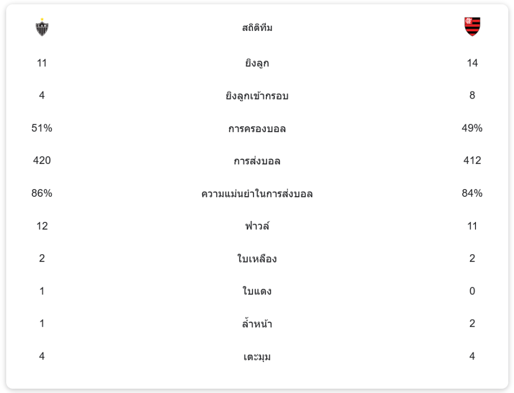 • ความแม่นยำในการส่งบอล: อัตเลติโก มิไนโร่ 86%, ฟลาเมงโก 84%