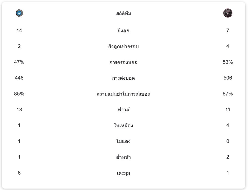 - ความแม่นยำในการส่งบอล: ชาร์ลอตต์ เอฟซี 85%, อินเตอร์ ไมอามี 87%