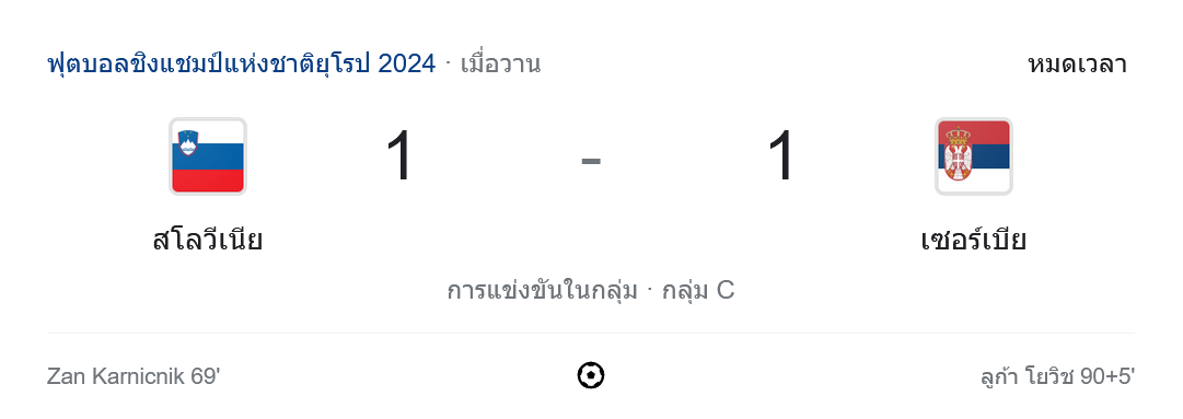 ผลบอลยูโร 2024 สโลวีเนีย 1-1 เซอร์เบีย กลุ่ม C 21/06/67