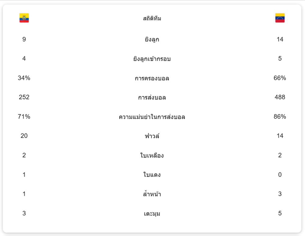 เกมเริ่มต้น เอกวาดอร์เปิดฉากบุกหนัก และเกือบได้ประตูขึ้นนำจากจังหวะยิงของ ปาเอซ แต่ โรโม นายทวารเวเนซุเอลาปัดทิ้งได้หวุดหวิด ก่อนที่โชคร้ายจะเล่นงาน ลา ตรี เมื่อ วาเลนเซีย โดนใบแดงไล่ออกจากสนามในนาทีที่ 19 หลัง VAR ตรวจสอบ