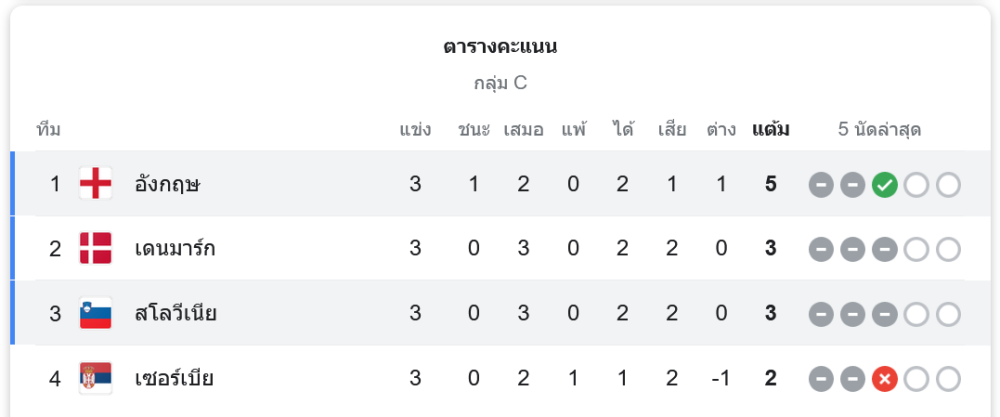 ส่วนอีกคู่ในกลุ่มเดียวกัน เดนมาร์กเสมอกับเซอร์เบีย 0-0 เช่นกัน ทำให้เดนมาร์กจบอันดับ 2 ด้วยคะแนนเท่าสโลวีเนีย แต่มีคะแนนด้านวินัยที่ดีกว่า