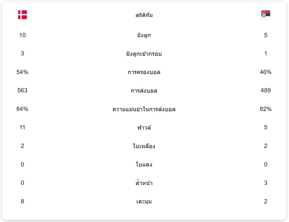 เกมดำเนินไปอย่างสูสี แม้เดนมาร์กจะครองบอลได้มากกว่า แต่ก็ยังขาดความเฉียบคมในการจบสกอร์ จบครึ่งแรกยังเสมอกัน 0-0