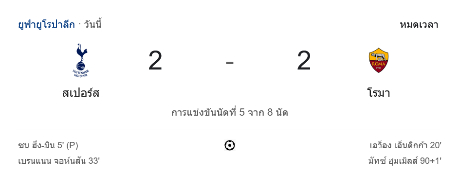 บ้านผลบอล สรุปผล ดวลเดือด ยูฟ่ายูโรปาลีก! ท็อตแน่ม ฮ็อทสเปอร์ ไล่ตามตีเสมอ โรม่า สุดระทึก 2-2
