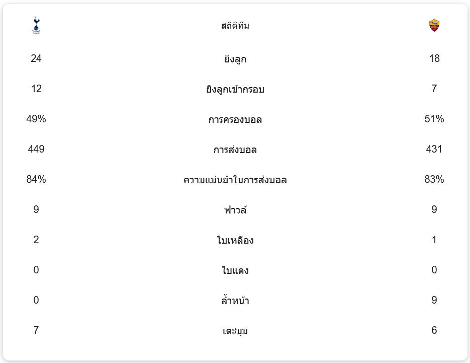 เกมนี้ ท็อตแน่ม ฮ็อทสเปอร์ มีโอกาสยิงมากถึง 24 ครั้ง ขณะที่ โรม่า ยิง 18 ครั้ง การครองบอลสูสีกัน โดย สเปอร์ส ครองบอล 49% และ โรม่า 51% ความแม่นยำในการส่งบอลอยู่ที่ 84% และ 83% ตามลำดับ ถือว่าเป็นเกมที่ทั้งสองทีมทุ่มสุดตัว