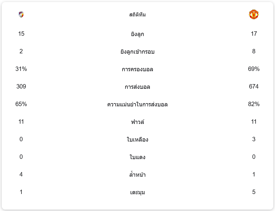 แมนฯ ยูไนเต็ดครองบอลได้ถึง 69% พร้อมสร้างโอกาสยิง 17 ครั้ง เข้ากรอบ 8 ครั้ง ในขณะที่วิคตอเรีย พัลเซ่นมีโอกาสยิง 15 ครั้ง แต่เข้ากรอบเพียง 2 ครั้ง แสดงให้เห็นถึงความเหนือกว่าของทีมเยือนในด้านการจบสกอร์