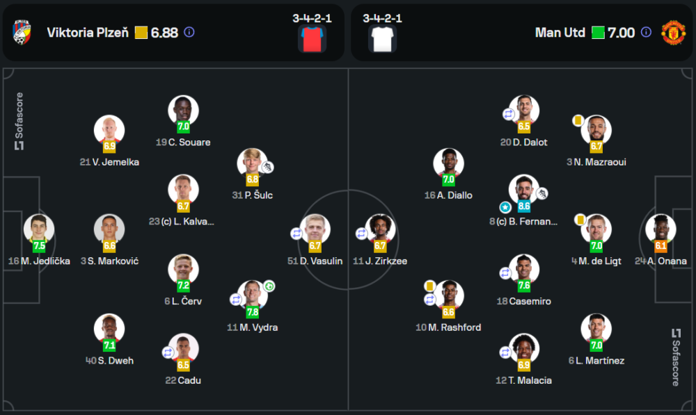 แมนฯ ยูไนเต็ดใช้ระบบ 3-4-2-1 โดยมี บรูโน่ แฟร์นันเดส เป็นศูนย์กลางในการสร้างเกมรุก ขณะที่ ราสมุส ฮอยลุนด์ ที่ถูกส่งลงมาครึ่งหลังแสดงให้เห็นถึงความอันตรายในกรอบเขตโทษ ส่วนวิคตอเรีย พัลเซ่นเน้นการตั้งรับลึกและโต้กลับด้วยระบบเดียวกัน แต่ขาดความแม่นยำในจังหวะสุดท้าย ทำให้แมนฯ ยูไนเต็ดมีความได้เปรียบและเก็บชัยชนะได้สำเร็จ
