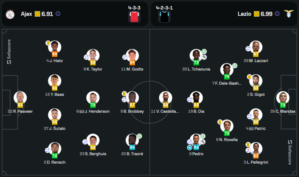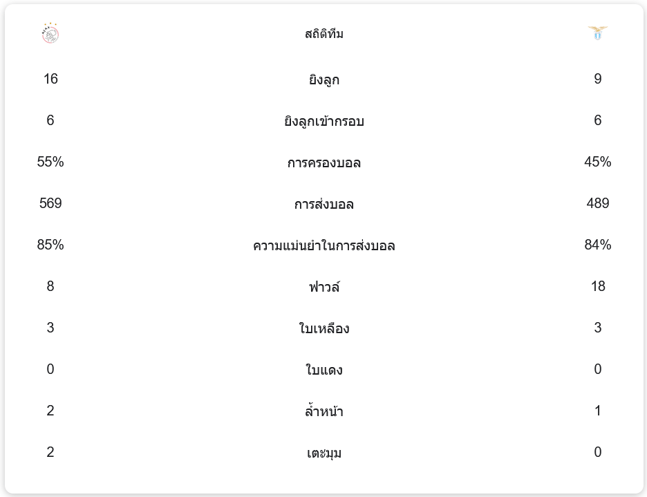 ลาซิโอยิงตรงกรอบ 6 ครั้งจากโอกาส 9 ครั้ง ในขณะที่อาแจกซ์ยิง 6 ครั้งจากโอกาส 16 ครั้ง การครองบอลของอาแจกซ์ที่ 55% อาจดูดีกว่า แต่ลาซิโอส่งบอลสำเร็จที่ 84% และสร้างโอกาสที่อันตรายกว่า