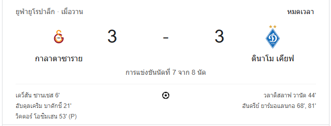 เกมจบลงด้วยผลเสมอ 3-3 ทั้งสองทีมแบ่งแต้มกันไปในศึกยูฟ่ายูโรปาลีกที่เต็มไปด้วยความเข้มข้น กาลาตาซารายและดินาโม เคียฟต่างแสดงฟอร์มที่น่าประทับใจ ทำให้เกมนี้กลายเป็นหนึ่งในแมตช์ที่น่าจดจำของฤดูกาล