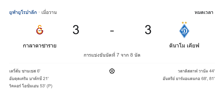 นาทีที่ 68 อันดรีย์ ยาร์โมเลนโก้ ทำประตูสุดสวยให้ เคียฟ พลิกแซงเป็น 3-2 ส่งเสียงเฮจากแฟนทีมเยือน แต่แล้วช่วงท้ายเกม นาทีที่ 81 ยาร์โมเลนโก้ คนเดิมมาโขกประตูที่สองของตัวเอง ช่วยให้ เคียฟ นำห่างเป็น 3-3 ทำให้จบเกมสุดมันส์ กาลาตาซาราย เสมอ ดินาโม เคียฟ 3-3