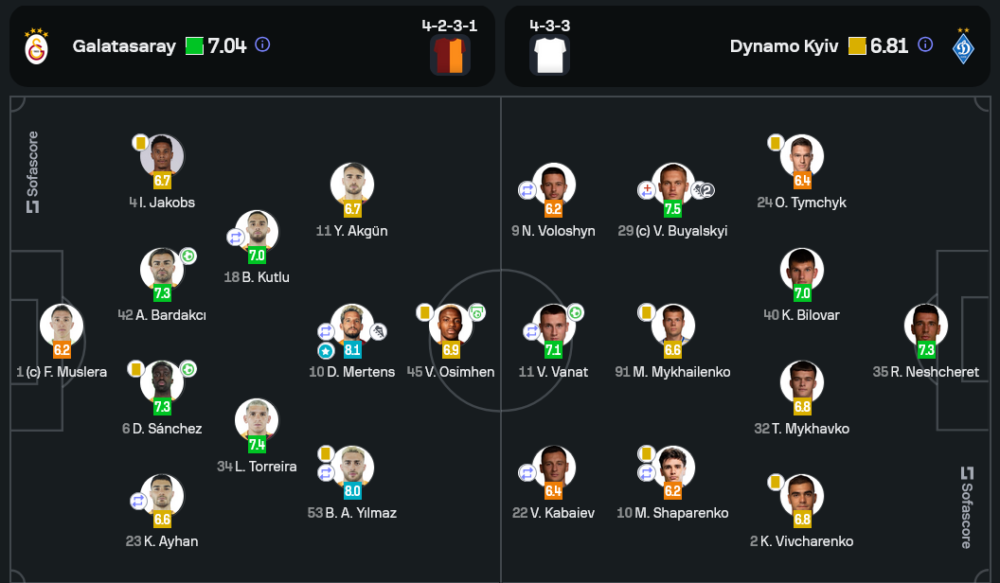 ดรีส์ เมอร์เทนส์ คือตัวทีเด็ดของ กาลาตาซาราย ในเกมนี้ เล่นได้อย่างยอดเยี่ยมทั้งการสร้างโอกาสและทำแอสซิสต์ โดยได้รับคะแนนสูงสุด 8.1