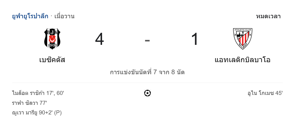 ศึก ยูฟ่ายูโรปาลีก 2024 นัดที่ 7 ของรอบแบ่งกลุ่มเมื่อคืนนี้เต็มไปด้วยความดุเดือดเมื่อ เบซิคตัส เจเค เปิดบ้านถล่ม แอธเลติก บิลเบา ไปแบบขาดลอย 4-1 ส่งผลให้สถานการณ์ในกลุ่มเริ่มเข้มข้นยิ่งขึ้น โดยเกมนี้ “อินทรีดำ” ระเบิดฟอร์มสุดยอด โดยมี มิโลต์ ราชิก้า และ ราฟา ซิลวา เป็นตัวขับเคลื่อนเกมรุก ขณะที่ทีมเยือนพลาดเสียประตูง่ายเกินไป บ้านกีฬา พามาดูรายละเอียดของเกมนี้กัน