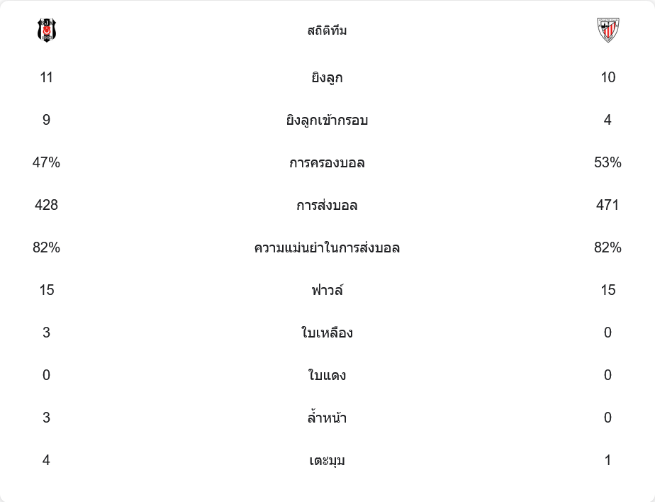 เบซิคตัสเป็นฝ่ายครองบอล 47% ส่วนแอธเลติก บิลเบา 53% แต่โอกาสยิงของเบซิคตัสอยู่ที่ 11 ครั้ง เข้ากรอบ 9 ขณะที่บิลเบาได้ยิง 10 ครั้ง เข้ากรอบ 4 การจ่ายบอลของทีมเยือนแม่นยำกว่าที่ 82% แต่แนวรับของพวกเขายังเสียประตูง่ายเกินไป ด้านเบซิคตัสมีลูกเตะมุม 4 ครั้ง ขณะที่บิลเบาได้เพียง 1 ครั้ง