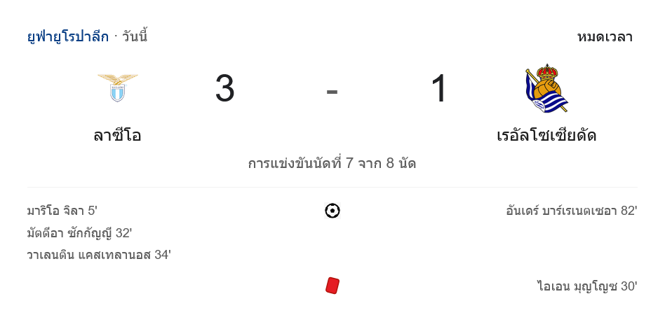 ศึก ยูฟ่ายูโรปาลีก 2024 รอบแบ่งกลุ่ม นัดที่ 7 จบลงด้วยชัยชนะของ ลาซิโอ ที่เปิดบ้านปราบ เรอัล โซเซียดาด 3-1 ในเกมที่มีทั้งใบแดง ความดุเดือด และการเล่นที่เข้มข้นตลอด 90 นาที ซึ่งแน่นอนว่า ผลบอลสด คู่นี้เป็นที่จับตามองของแฟนบอลทั้งสองทีม