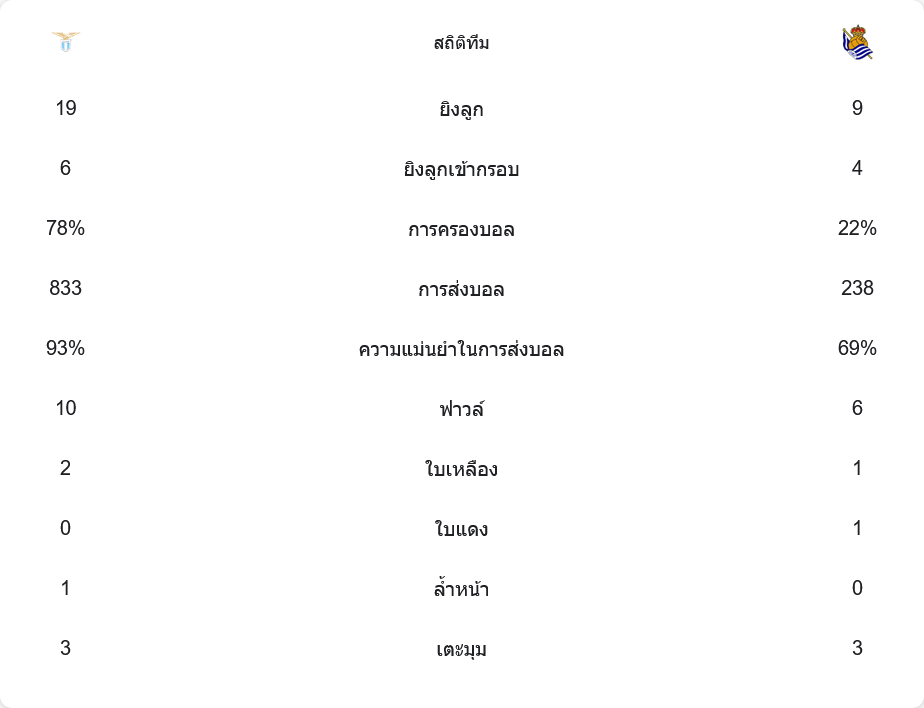 - ลาซิโอ: ยิง 19 ครั้ง เข้ากรอบ 6 ครั้ง ครองบอล 78% ส่งบอล 833 ครั้ง ความแม่นยำ 93%