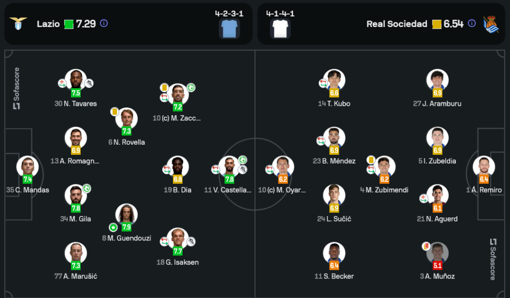เรอัล โซเซียดาด มาในระบบ 4-1-4-1 แต่หลังจากโดนใบแดงในครึ่งแรก เกมรับเสียสมดุล ทำให้ทีมเสียถึง 3 ประตูในเวลาเพียงครึ่งแรก พวกเขามีโอกาสยิงเพียง 9 ครั้ง แต่คุณภาพการเข้าทำยังสู้ลาซิโอไม่ได้