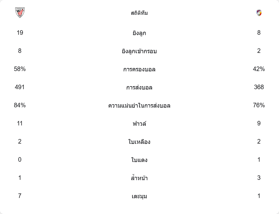 จากตัวเลขเหล่านี้ชัดเจนว่า บิลเบาคุมเกมไว้ได้หมดทุกมิติ ไม่ว่าจะเป็นการครองบอล เกมรุกที่เฉียบคมกว่า และเกมรับที่แข็งแกร่ง ส่งผลให้พวกเขาเป็นฝ่ายคว้าชัยไปครองอย่างสมบูรณ์แบบ