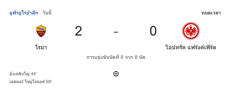 ช่วงท้ายเกมแม้แฟร้งค์เฟิร์ตจะพยายามบุก แต่ไม่สามารถทวงคืนประตูได้ จบเกม โรม่า เอาชนะ 2-0 คว้าสามแต้มสำคัญไปครอง