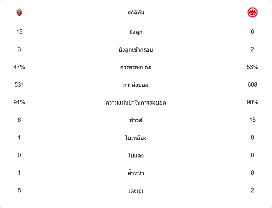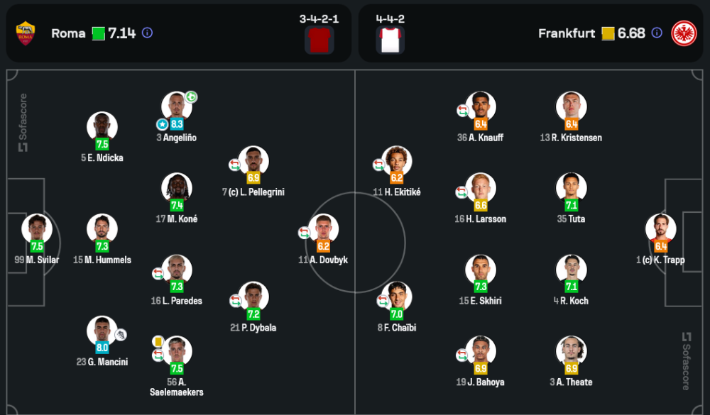 แม้ว่าแฟร้งค์เฟิร์ตจะครองบอล 53% มากกว่าโรม่า 47% แต่พวกเขากลับสร้างโอกาสได้น้อยกว่า โดยมีโอกาสยิงเพียง 6 ครั้ง และยิงเข้ากรอบเพียง 2 ครั้ง เทียบกับโรม่าที่มีโอกาสยิงถึง 15 ครั้ง และยิงเข้ากรอบ 3 ครั้ง โรม่าใช้การผ่านบอลที่แม่นยำถึง 91% จากการส่งบอล 531 ครั้ง ในขณะที่แฟร้งค์เฟิร์ตส่งบอลมากกว่า 608 ครั้ง แต่มีความแม่นยำแค่ 90%