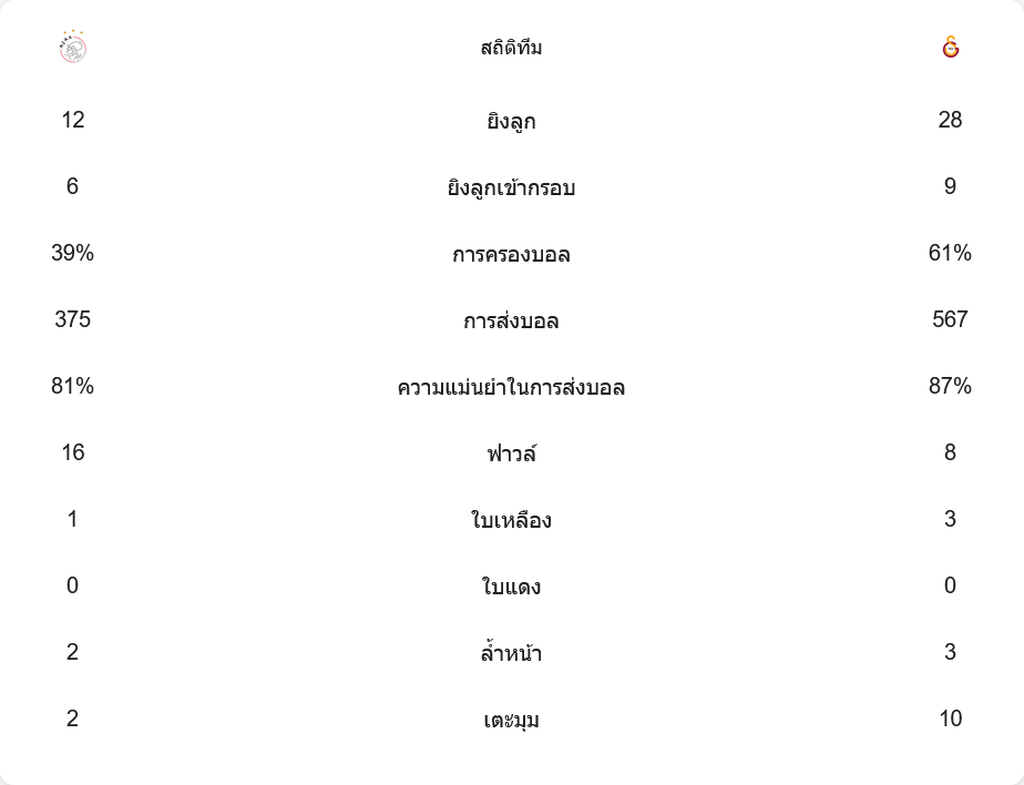 อาแจกซ์ครองบอลได้ 61% เทียบกับ 39% ของกาลาตาซาราย พวกเขามีโอกาสยิงถึง 28 ครั้ง เข้ากรอบ 9 ครั้ง ขณะที่กาลาตาซารายมีโอกาสยิง 12 ครั้ง และเข้ากรอบ 6 ครั้ง การจ่ายบอลของอาแจกซ์มีความแม่นยำสูงถึง 87% ขณะที่กาลาตาซารายแม่นยำ 81% ด้านเกมรับ อาแจกซ์เล่นได้เหนียวแน่นกว่าและมีการป้องกันที่มีวินัย ส่งผลให้พวกเขาเก็บชัยชนะไปในที่สุด