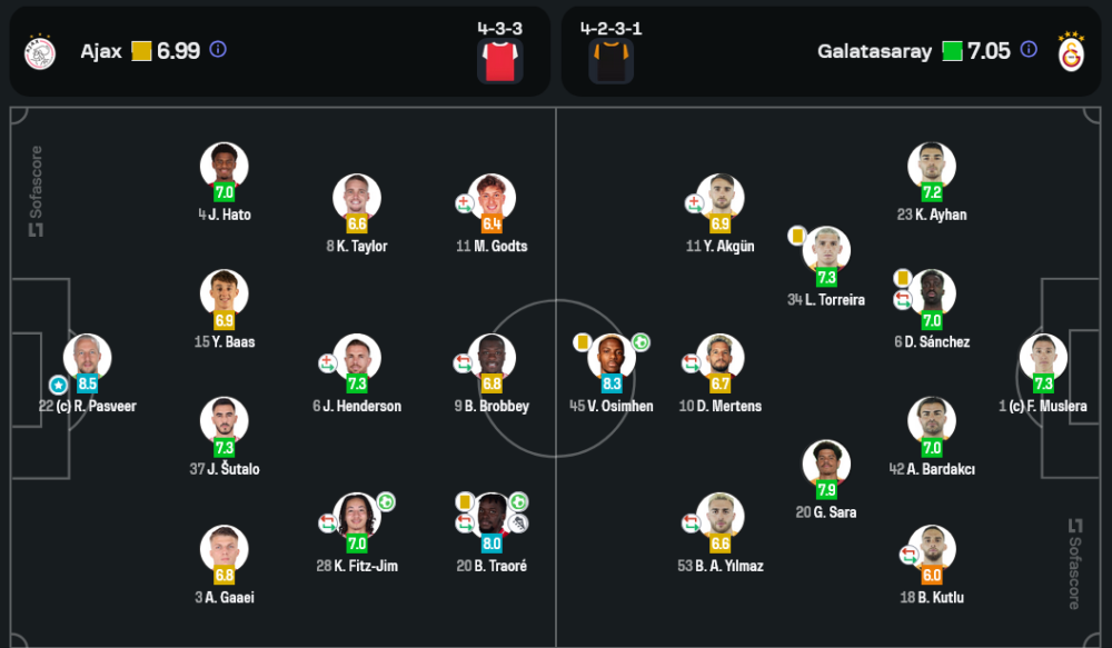อาแจกซ์เลือกใช้แผน 4-3-3 โดยให้แนวรุกสามประสาน ตราโอเร่, บร็อบบี้ และ ก็อดต์ เป็นตัวหลักในการเข้าทำ เกมนี้พวกเขาใช้การครองบอลที่เหนือกว่าเพื่อกดดันกาลาตาซารายตั้งแต่ต้นเกม ส่วนกาลาตาซารายมาในระบบ 4-2-3-1 ที่เน้นการสวนกลับเร็วผ่าน โอซิมเฮน และ ซารา ซึ่งสร้างปัญหาให้แนวรับอาแจกซ์ได้หลายครั้ง แต่น่าเสียดายที่ความเฉียบขาดยังไม่มากพอ
