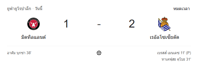 - นาทีที่ 96 กรรมการเป่านกหวีดจบเกม เอฟซี มิดทิลแลนด์แพ้เรอัล โซเซียดาด 1-2