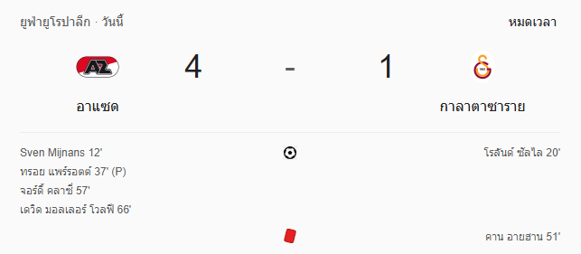 - นาทีที่ 48 กรรมการเป่านกหวีดจบครึ่งแรก AZ อัลค์มาร์ 2-1 กาลาตาซาราย