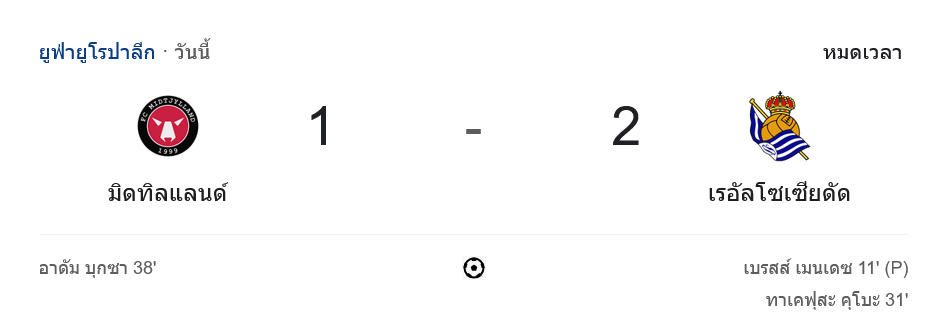 ช่วงท้ายเกม เจ้าถิ่นพยายามทวงประตูตีเสมอ แต่ต้องเจอเกมรับที่เหนียวแน่นของโซเซียดาด ขณะที่ฝั่งทีมเยือนก็มีจังหวะสวนกลับหลายครั้ง แต่ไม่สามารถเปลี่ยนเป็นประตูได้ จบเกม เรอัล โซเซียดาด บุกชนะ มิดทิลแลนด์ 2-1 คว้าสามแต้มล้ำค่า!
