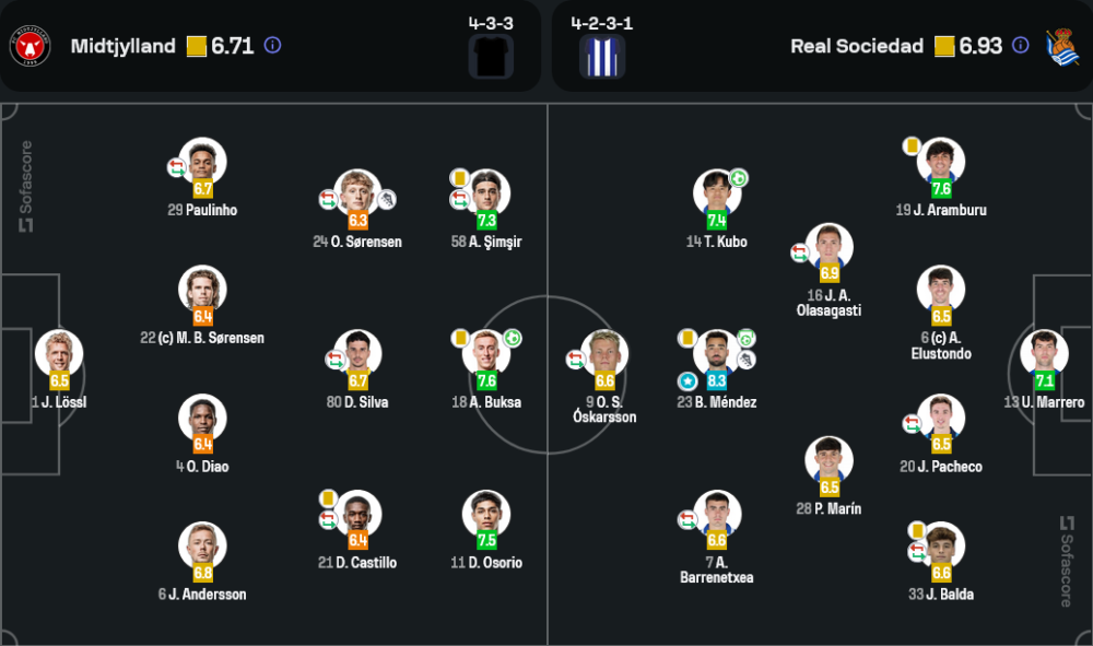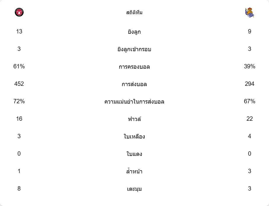 แม้ว่า มิดทิลแลนด์ จะครองบอลได้มากถึง 61% และมีโอกาสยิงถึง 13 ครั้ง แต่พวกเขาสามารถส่งบอลเข้ากรอบได้เพียง 3 ครั้งเท่านั้น ขณะที่ เรอัล โซเซียดาด ที่ครองบอลน้อยกว่ากลับใช้โอกาสอย่างคุ้มค่า โดยเปลี่ยน 2 จาก 3 ครั้งที่ยิงเข้ากรอบให้เป็นประตูได้ ความแม่นยำในการส่งบอลของเจ้าถิ่นสูงถึง 72% เมื่อเทียบกับ 67% ของทีมเยือน แต่จำนวนฟาวล์ของโซเซียดาดอยู่ที่ 22 ครั้ง ซึ่งแสดงให้เห็นว่าพวกเขาเล่นเกมรับอย่างหนักหน่วง ส่วนมิดทิลแลนด์ทำฟาวล์ 16 ครั้งและได้ใบเหลือง 3 ใบ ในขณะที่เรอัล โซเซียดาดได้ไป 4 ใบ