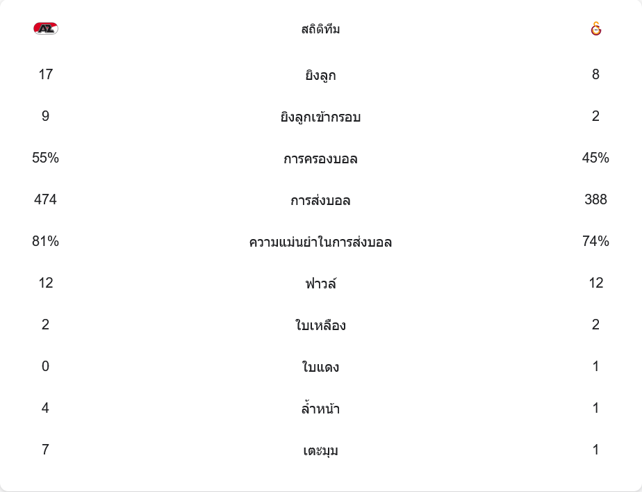 แม้กาลาตาซารายจะมีเปอร์เซ็นต์การครองบอล 45% และพยายามเปิดเกมสู้ แต่พวกเขามีโอกาสยิงเพียง 8 ครั้งเท่านั้น และตรงกรอบแค่ 2 ครั้ง ต่างจากอาแซ่ดที่สร้างสรรค์โอกาสได้ถึง 17 ครั้ง และเปลี่ยนเป็น 4 ประตูได้สำเร็จ อัตราการจ่ายบอลแม่นยำของอาแซ่ดอยู่ที่ 81% ขณะที่กาลาตาซารายแม่นยำ 74% ทั้งสองทีมเล่นกันหนักหน่วงโดยมีฟาวล์เท่ากันที่ 12 ครั้ง แต่กาลาตาซารายเสียเปรียบอย่างมากจากใบแดงที่ทำให้พวกเขาต้องเล่น 10 คน