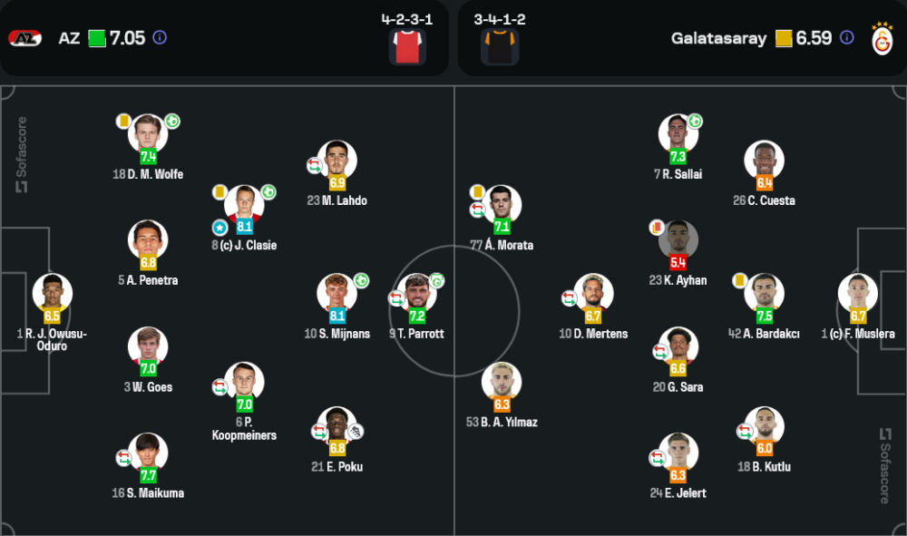 อาแซ่ด อัลค์มาร์ เล่นด้วยความมั่นใจเต็มที่ในระบบ 4-2-3-1 โดยใช้ความได้เปรียบจากเกมในบ้านบุกเข้าใส่ทันที พวกเขามีการครองบอลสูงถึง 55% และสร้างโอกาสยิงได้มากถึง 17 ครั้ง ซึ่ง 9 ครั้งเป็นการยิงตรงกรอบ การเล่นริมเส้นของ เซยา ไมคูม่า และ มิโล ลาห์โด ทำให้แนวรับของกาลาตาซารายปั่นป่วนตลอดเกม