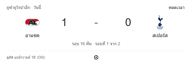 - นาทีที่ 48 กรรมการเป่าหมดครึ่งแรก AZ อัลค์มาร์ 1-0 ท็อตแน่ม ฮ็อตสเปอร์