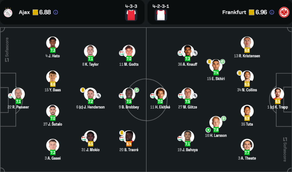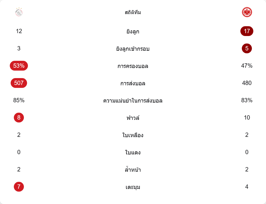 แม้ว่า อาแจกซ์ จะครองบอลได้มากกว่า 53% และมีการส่งบอล 507 ครั้งด้วยความแม่นยำ 85% แต่การจบสกอร์ยังเป็นปัญหา โดยพวกเขายิงเข้ากรอบเพียง 3 ครั้ง ขณะที่ ไอน์ทรัค แฟรงเฟิร์ต ยิงได้ถึง 17 ครั้ง และเข้ากรอบ 5 ครั้ง พร้อมกับเกมรับที่จัดระเบียบได้ดี ทำให้เจ้าบ้านไม่สามารถทำอะไรได้มากนัก