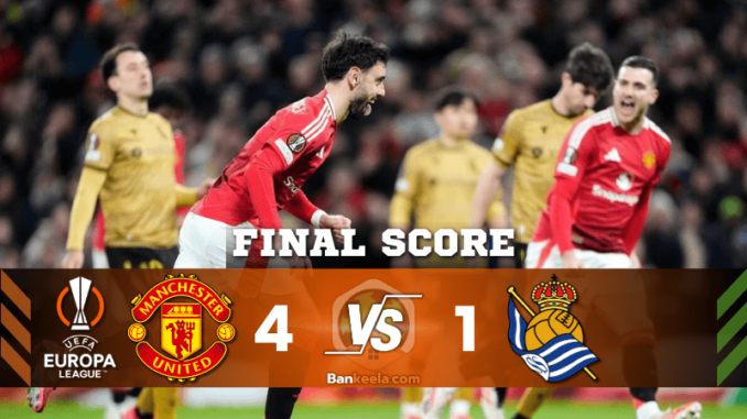 บ้านกีฬา พาคุณเจาะลึก ผลบอลสด จากศึก ยูฟ่ายูโรปาลีก 2024 รอบ 16 ทีมสุดท้าย เกมระหว่าง แมนเชสเตอร์ ยูไนเต็ด เปิดรังโอลด์แทรฟฟอร์ด ดวลเดือดกับ เรอัล โซเซียดาด เกมนี้ “ปีศาจแดง” เดินหน้าไล่บดขยี้ทีมเยือนแบบสุดมันส์ และเป็น บรูโน่ แฟร์นันด์ส ที่โชว์ฟอร์มโหดกดแฮตทริกพาทีมคว้าชัย 4-1 ตีตั๋วเข้ารอบต่อไปได้อย่างสมศักดิ์ศรี!