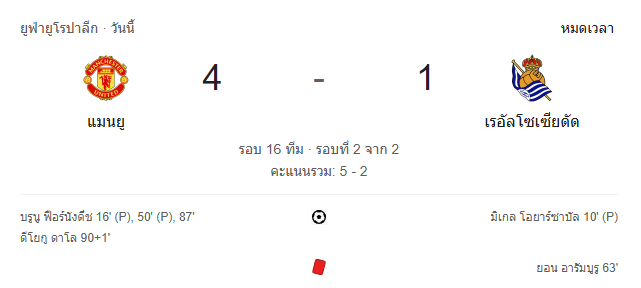 เกมนี้ แมนเชสเตอร์ ยูไนเต็ด โชว์ฟอร์มดุจัดเต็ม ไล่ถล่ม เรอัล โซเซียดาด ไปแบบขาดลอย โดยเฉพาะ บรูโน่ แฟร์นันด์ส ที่ซัดแฮตทริกช่วยให้ทีมผ่านเข้ารอบ 8 ทีมสุดท้ายได้อย่างยิ่งใหญ่ ด้านทีมเยือนแม้จะเริ่มต้นดีจากจุดโทษต้นเกม แต่โดนความเฉียบขาดของปีศาจแดงเล่นงาน จนต้องจอดป้ายที่รอบนี้