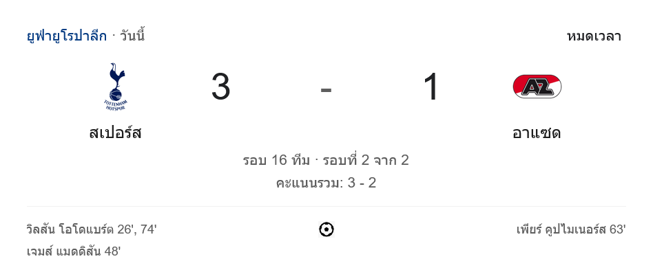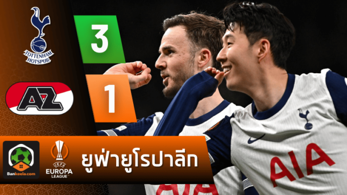 “ไก่เดือยทอง” ท็อตแน่ม ฮ็อทสเปอร์ โชว์ฟอร์มดุดันในศึก ยูฟ่ายูโรปาลีก รอบ 16 ทีมสุดท้าย นัดที่ 2 เปิดบ้านอัด อาแซด อัลค์มาร์ 3-1 พลิกเข้ารอบด้วยสกอร์รวม 3-2 โดยมี วิลสัน โอด็อบแอร์ต ปีกตัวจี๊ดเป็นพระเอกของเกม กดสองประตูพาทีมลิ่วไปต่อ ขณะที่ บ้านผลบอล รายงานว่าเกมนี้ สเปอร์ส คุมเกมเหนือกว่าอย่างชัดเจน