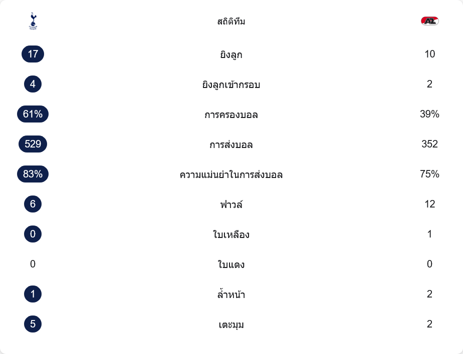 แม้ว่า อาแซด จะพยายามสู้ แต่ สเปอร์ส คุมเกมได้เหนือกว่าทั้งเรื่องการครองบอล 61% ต่อ 39% และการส่งบอลที่แม่นยำกว่า 83% เทียบกับ 75% ของอาแซด การยิงเข้ากรอบของเจ้าถิ่นมีถึง 4 ครั้ง ขณะที่ทีมเยือนมีเพียง 2 ครั้ง