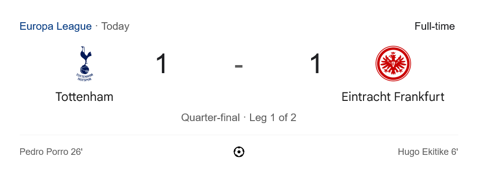 ศึก ยูฟ่ายูโรปาลีก 2025 รอบก่อนรองชนะเลิศ นัดแรก คู่ระหว่าง ท็อตแน่ม ฮ็อตสเปอร์ เปิดบ้านพบ ไอน์ทรัค แฟรงเฟิร์ต จบลงด้วยผลเสมอ 1-1 แบบสุดเดือด เกมที่ลอนดอนร้อนระอุตั้งแต่นาทีแรก และใครที่กำลังเช็ก ผลบอลสด คู่นี้บอกเลยว่าไม่ควรพลาดสักวินาที บ้านกีฬา พามาเจาะลึกทุกมุมในเกมนี้อย่างถึงใจ