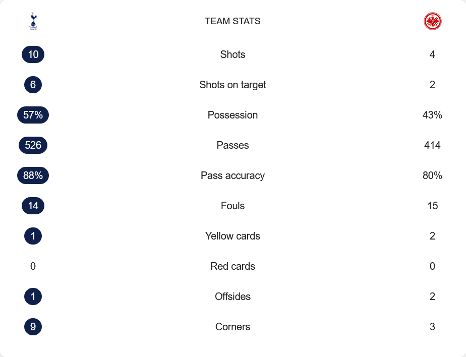 สเปอร์สเหนือกว่าอย่างชัดเจนในเรื่องการครองเกม โดยครองบอลถึง 57% และผ่านบอลได้มากถึง 526 ครั้งด้วยความแม่นยำ 88% ขณะที่แฟรงเฟิร์ตครองบอลเพียง 43% และผ่านบอล 414 ครั้งด้วยความแม่นยำ 80% โอกาสยิงของเจ้าบ้านมีถึง 10 ครั้ง เข้ากรอบ 6 ส่วนทีมเยือนมีแค่ 4 ครั้ง เข้ากรอบเพียง 2 นอกจากนั้น สเปอร์สได้เตะมุมมากถึง 9 ครั้ง เทียบกับแฟรงเฟิร์ตที่ได้เพียง 3 โอกาส โดยรวมคือเกมที่เจ้าบ้านควบคุมได้แต่ไม่เฉียบคมพอจะคว้าชัย