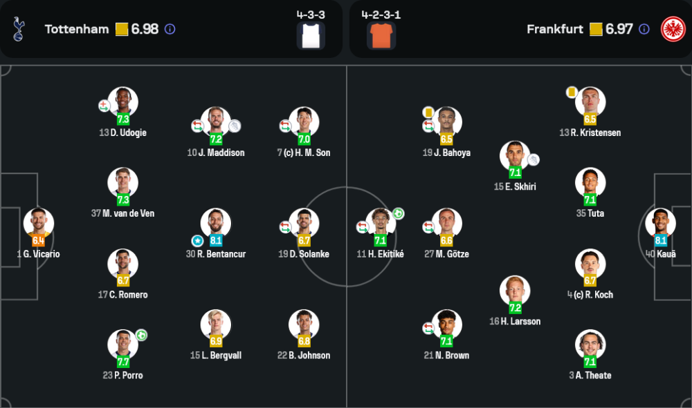 ฝั่งแฟรงเฟิร์ตเลือกใช้ระบบ 4-2-3-1 เน้นการตั้งโซนรับและรอโต้กลับ โดยมี เอกิติเก้ เป็นหัวหอกที่ใช้ความเร็วและความคล่องตัวเล่นงานแนวรับคู่แข่ง เกมของพวกเขาดูชัดเจนในแท็คติกแต่ขาดความหลากหลายเมื่อเข้าสู่พื้นที่สุดท้าย เมื่อวิเคราะห์ วิเคราะห์บอล เชิงลึก เกมของแฟรงเฟิร์ตพึ่งพาการเปลี่ยนจังหวะมากไป และเมื่อสเปอร์สปรับการยืนตำแหน่งได้ดี พวกเขาก็แทบไม่มีโอกาสจะแจ้งเลยในครึ่งหลัง
