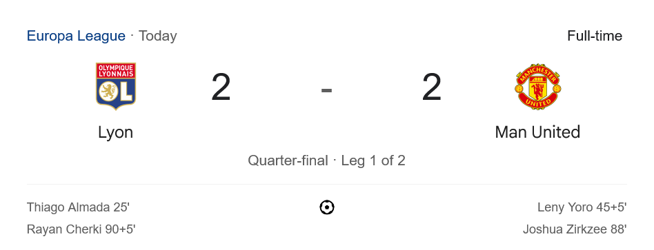 ผลเสมอ 2-2 ในเลกแรก ทำให้เกมยังเปิดกว้างสำหรับทั้งสองทีมก่อนเข้าสู่เลกสองที่ โอลด์ แทรฟฟอร์ด โดย แมนเชสเตอร์ ยูไนเต็ด จะได้เปรียบในเรื่องประตูทีมเยือน ส่วน โอลิมปิก ลียง ยังมีโอกาสผ่านเข้ารอบหากสามารถบุกไปชนะได้ในเกมถัดไป
